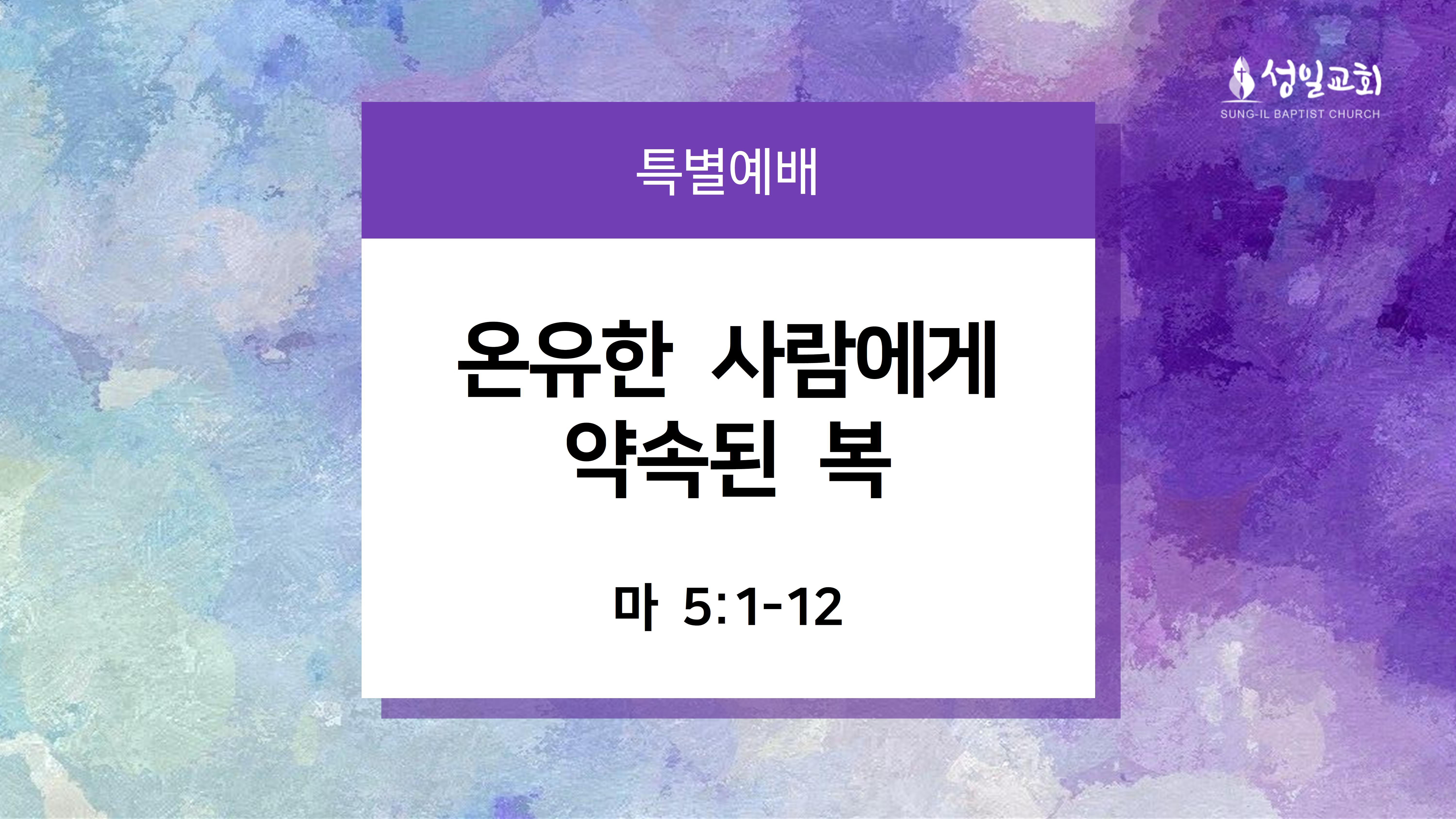 [성경본문] 마태복음5:1-12절 개역개정1. 예수께서 무리를 보시고 산에 올라가 앉으시니 제자들이 나아온지라 2. 입을 열어 가르쳐 이르시되 3. 심령이 가난한 자는 복이 있나니 천국이 그들의 것임이요 4. 애통하는 자는 복이 있나니 그들이 위로를 받을 것임이요 5. 온유한 자는 복이 있나니 그들이 땅을 기업으로 받을 것임이요 6. 의에 주리고 목마른 자는 복이 있나니 그들이 배부를 것임이요 7. 긍휼히 여기는 자는 복이 있나니 그들이 긍휼히 여김을 받을 것임이요 8. 마음이 청결한 자는 복이 있나니 그들이 하나님을 볼 것임이요 9. 화평하게 하는 자는 복이 있나니 그들이 하나님의 아들이라 일컬음을 받을 것임이요 10. 의를 위하여 박해를 받은 자는 복이 있나니 천국이 그들의 것임이라 11. 나로 말미암아 너희를 욕하고 박해하고 거짓으로 너희를 거슬러 모든 악한 말을 할 때에는 너희에게 복이 있나니 12. 기뻐하고 즐거워하라 하늘에서 너희의 상이 큼이라 너희 전에 있던 선지자들도 이같이 박해하였느니라 ■ 주일 오전 설교(2022/05/01) 제 목: 온유한 사람에게 약속된 복 본 문: 마태복음 5:1-12 설교자: 이상현 원로목사