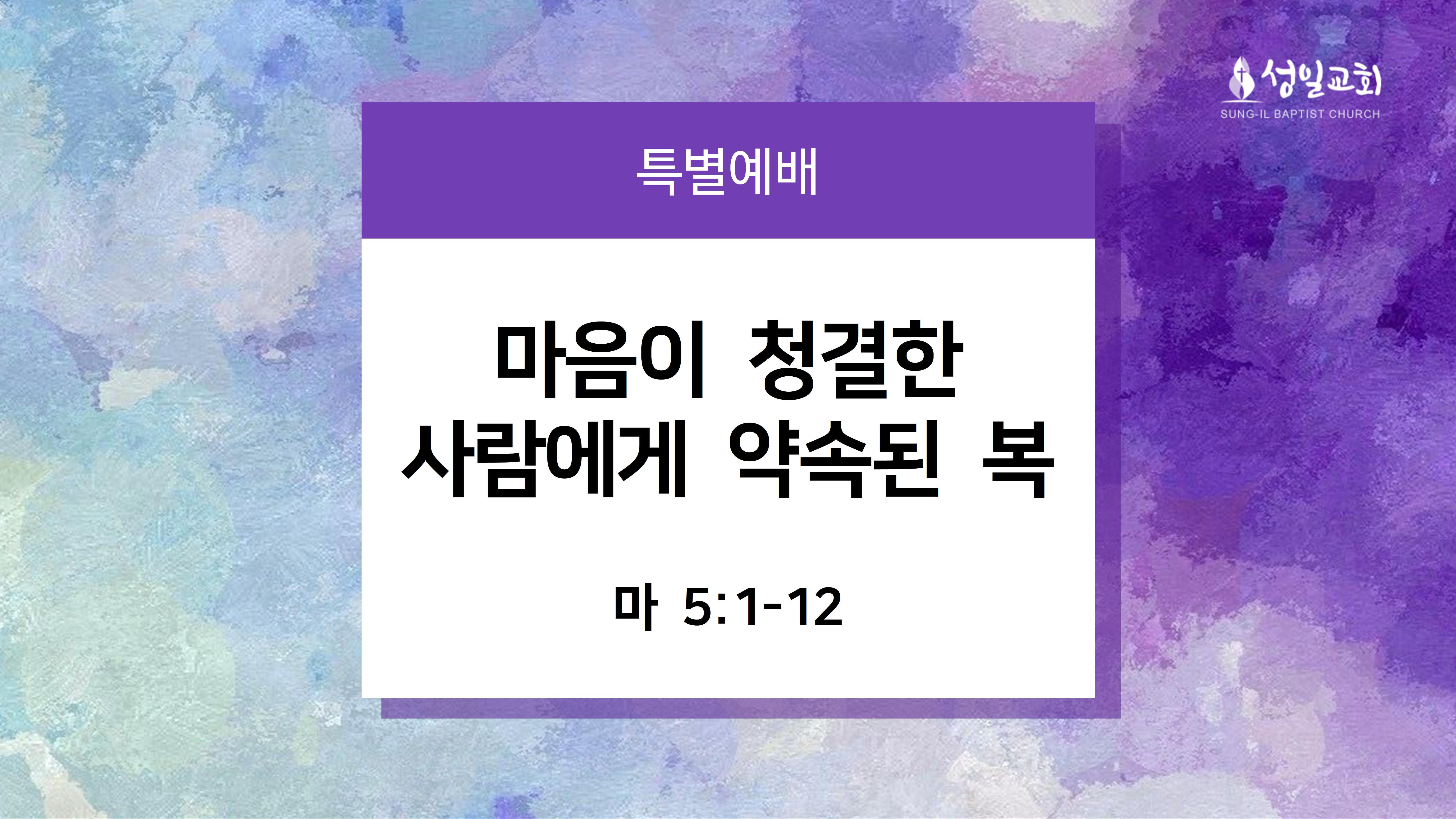 [성경본문] 마태복음5:1-12절 개역개정1. 예수께서 무리를 보시고 산에 올라가 앉으시니 제자들이 나아온지라 2. 입을 열어 가르쳐 이르시되 3. 심령이 가난한 자는 복이 있나니 천국이 그들의 것임이요 4. 애통하는 자는 복이 있나니 그들이 위로를 받을 것임이요 5. 온유한 자는 복이 있나니 그들이 땅을 기업으로 받을 것임이요 6. 의에 주리고 목마른 자는 복이 있나니 그들이 배부를 것임이요 7. 긍휼히 여기는 자는 복이 있나니 그들이 긍휼히 여김을 받을 것임이요 8. 마음이 청결한 자는 복이 있나니 그들이 하나님을 볼 것임이요 9. 화평하게 하는 자는 복이 있나니 그들이 하나님의 아들이라 일컬음을 받을 것임이요 10. 의를 위하여 박해를 받은 자는 복이 있나니 천국이 그들의 것임이라 11. 나로 말미암아 너희를 욕하고 박해하고 거짓으로 너희를 거슬러 모든 악한 말을 할 때에는 너희에게 복이 있나니 12. 기뻐하고 즐거워하라 하늘에서 너희의 상이 큼이라 너희 전에 있던 선지자들도 이같이 박해하였느니라 ■ 주일 오전 설교(2022/06/26) 제 목: 마음이 청결한 사람에게 약속된 복 본 문: 마태복음 5:1-12 설교자: 이상현 원로목사