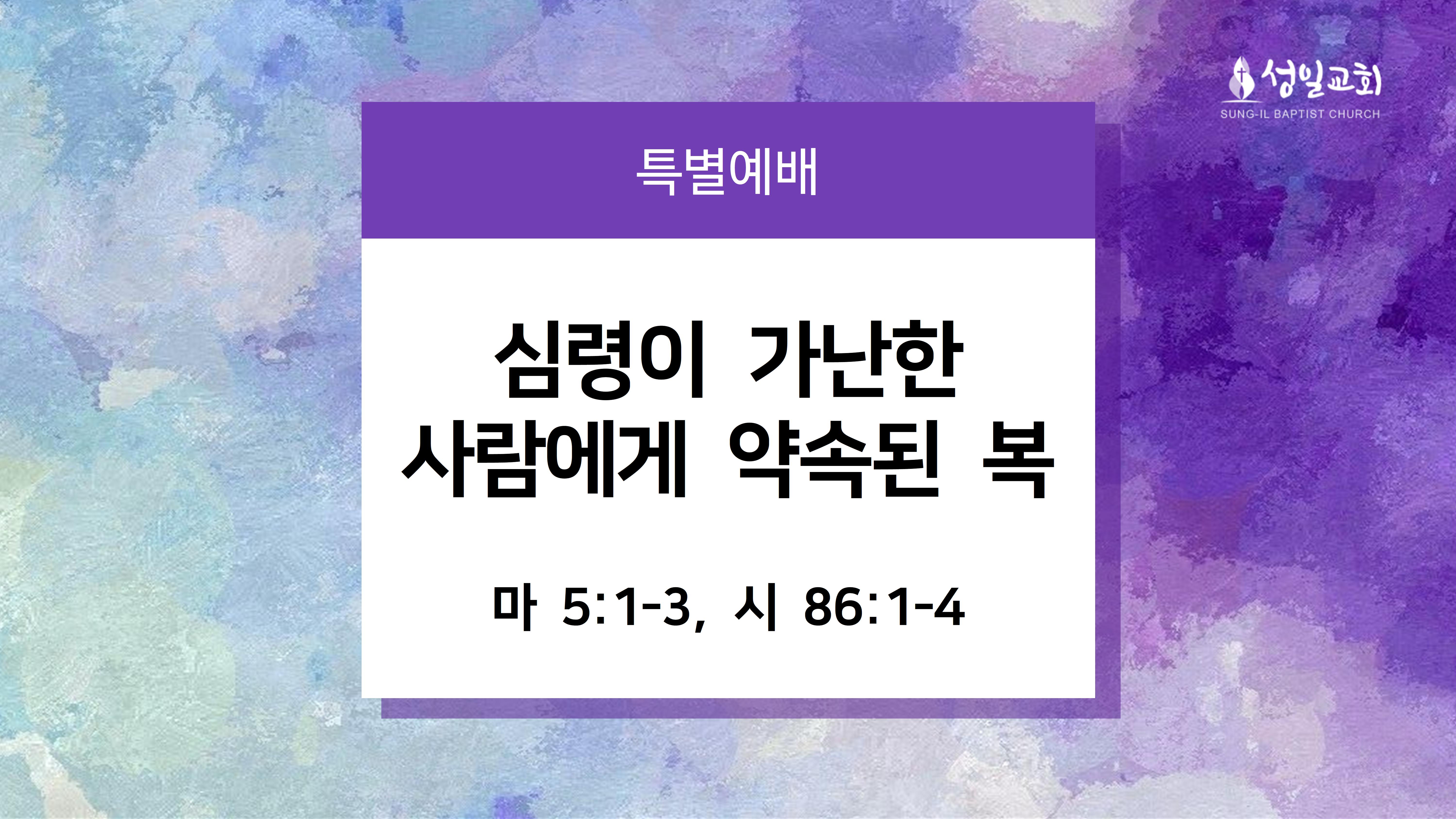 [성경본문] 마태복음5:1-3절 개역개정1. 예수께서 무리를 보시고 산에 올라가 앉으시니 제자들이 나아온지라 2. 입을 열어 가르쳐 이르시되 3. 심령이 가난한 자는 복이 있나니 천국이 그들의 것임이요 [성경본문] 시편86:1-4절 개역개정1. 여호와여 나는 가난하고 궁핍하오니 주의 귀를 기울여 내게 응답하소서 2. 나는 경건하오니 내 영혼을 보존하소서 내 주 하나님이여 주를 의지하는 종을 구원하소서 3. 주여 내게 은혜를 베푸소서 내가 종일 주께 부르짖나이다 4. 주여 내 영혼이 주를 우러러보오니 주여 내 영혼을 기쁘게 하소서 ■ 주일 오전 설교(2022/08/21) 제 목: 심령이 가난한 사람에게 약속된 복 본 문: 마태복음 5:1-3, 시편 86:1-4 설교자: 이상현 원로목사